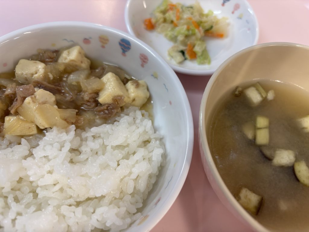 ごはん、みそ汁、肉豆腐、キャベツのごまマヨ