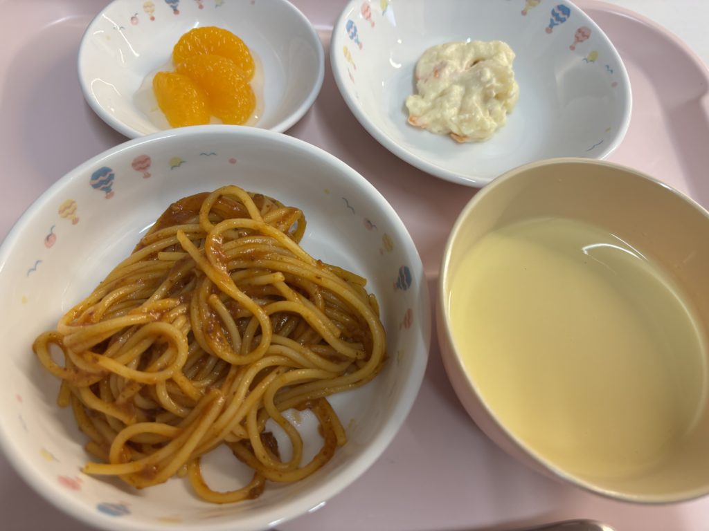 ミートスパゲッティ、コーンスープ🌽、ポテトサラダ、みかん缶