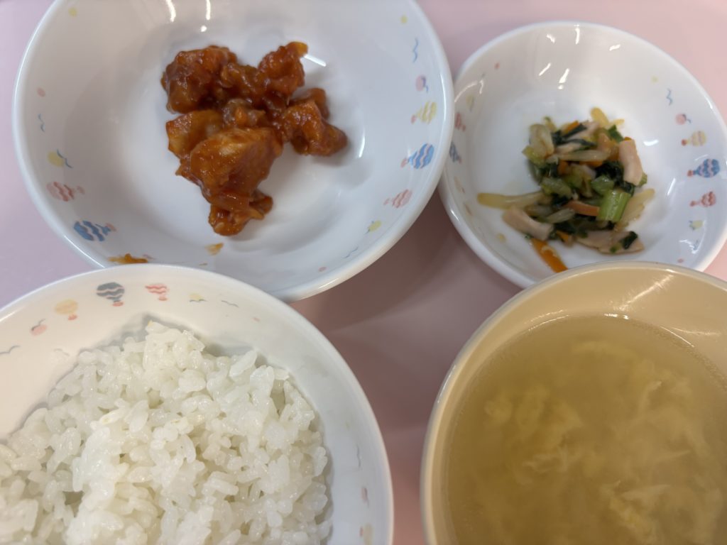 ごはん、たまごスープ、ヤンニョムチキン、小松菜サラダ🥬