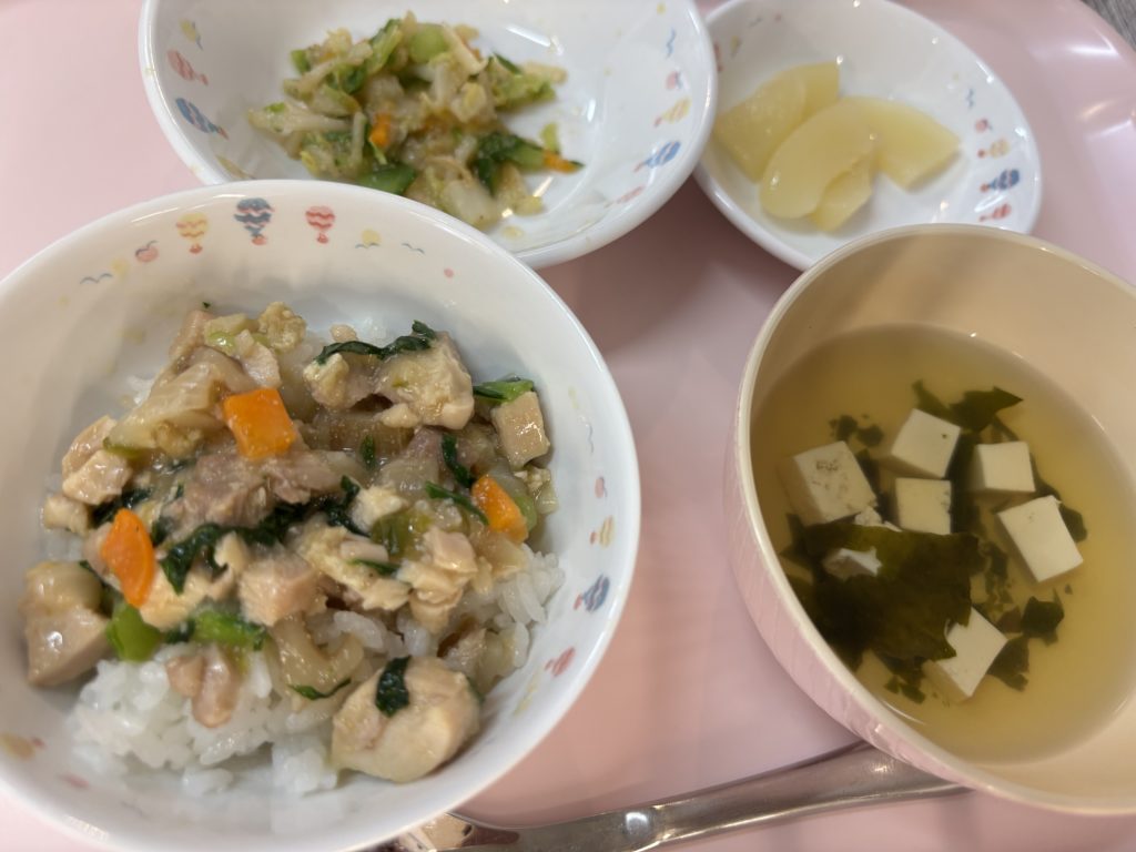 鶏肉のみそ丼、すまし汁、白菜ときゅうりのごま和え、もも缶🍑
