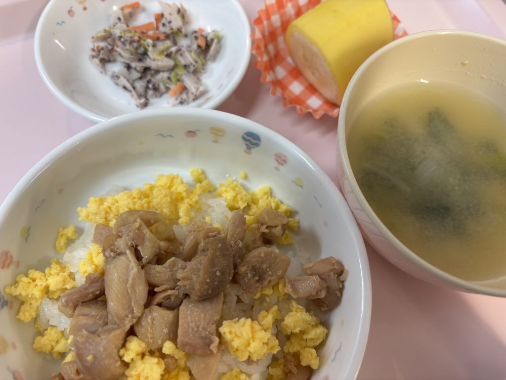 きじ焼き丼、みそ汁、ごぼうのゆかりマヨ和え、バナナ🍌