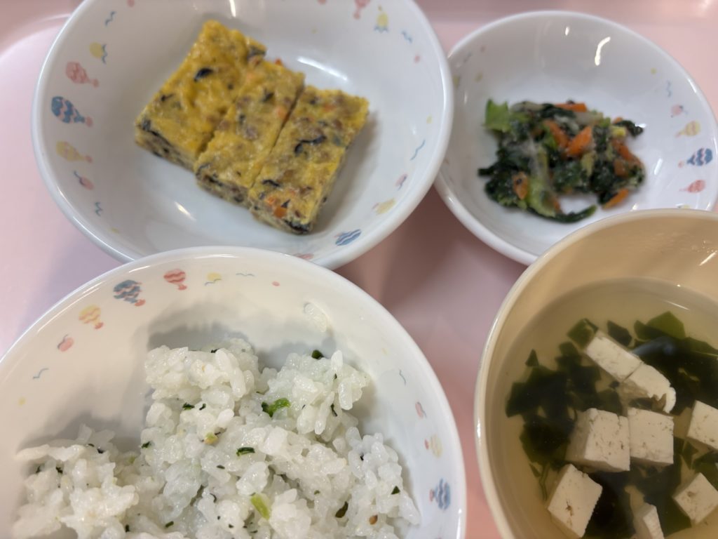 わかめごはん、すまし汁、千草焼き、小松菜のごま和え