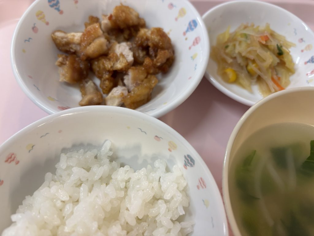 ごはん、小松菜のスープ、鶏肉のかりん揚げ、春雨サラダ