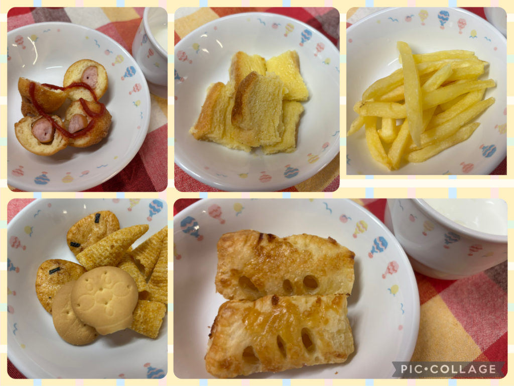 アメリカンドッグ、フレンチトースト、フライドポテト、市販菓子、アップルパイ🍎