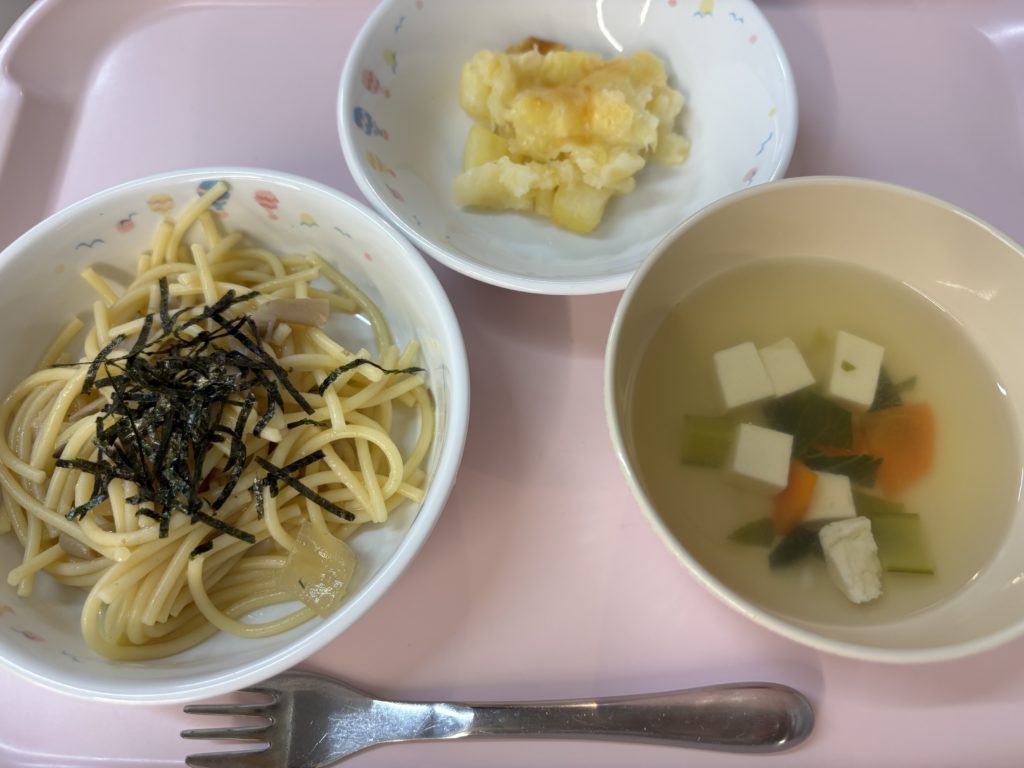 和風きのこスパゲティ、豆腐とチンゲン菜のスープ、じゃがいも🥔のチーズ焼き