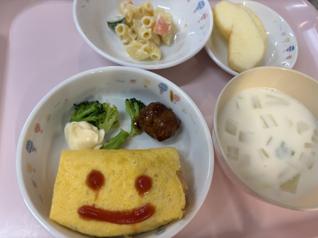 オムライスとミートボール、ミルクスープ、マカロニサラダ、りんご🍎