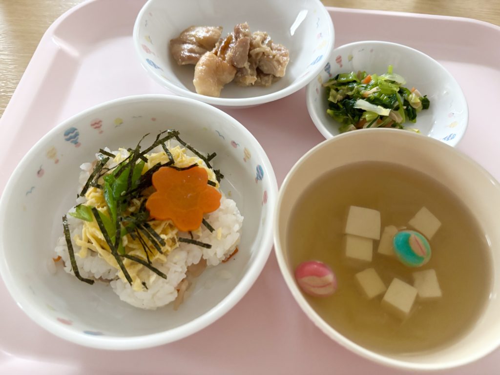 ひなちらし、すまし汁、鶏肉の香味焼き、小松菜のなめ茸和え
