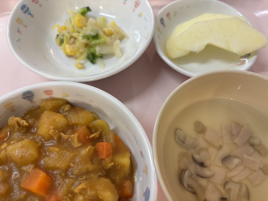 ポークカレー、コンソメスープ、フレンチサラダ、りんご🍎