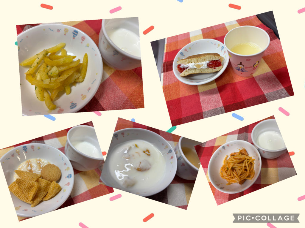 フライドポテト、ひな祭りデザート、市販菓子、フルーツヨーグルト、ナポリタン